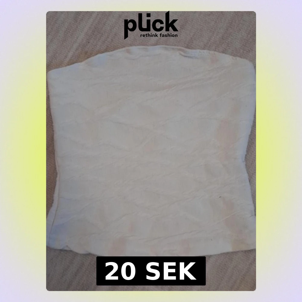 Säljer en vit bandeau tubtopp från SHEIN i storlek XS. Toppen är ribbad och har en enkel, stilren design utan axelband. Materialet är mjukt och stretchigt, perfekt för varma dagar eller som layering-piece. Finns en liten brun fläck på ryggen men syns inte om man skulle ha en kofta över. !!endast swish +frakt!!