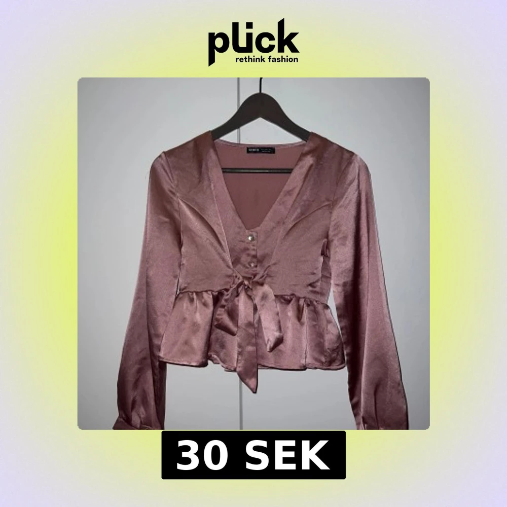 Elegant rosa satinblus med v-ringning och knytband i midjan. Blusen har långa ärmar och en fin volangdetalj nedtill. Perfekt för en stilfull look.