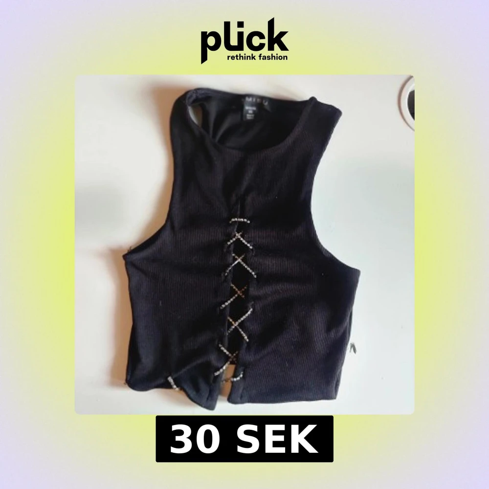 Snygg svart ribbad linnetopp med cool snörning framtill. Perfekt för en trendig look. Passar bra till både jeans och kjol. 🖤 Jag skulle nog säga att den ger av en club känsla, är öppen i mitten för en lite exposed känsla. Den är XS men fick plats på mig som är M till L.