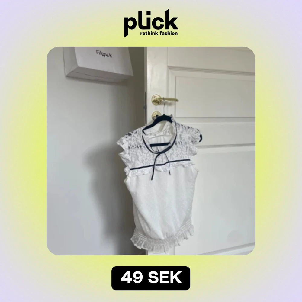 Säljer en superfin vit blus. Den har vackra spetsdetaljer på axlarna och runt halsen, med en söt liten rosett framtill. Blusen är ärmlös och har en volangkant längst ner. Perfekt för sommarens fester eller en dag på stan!