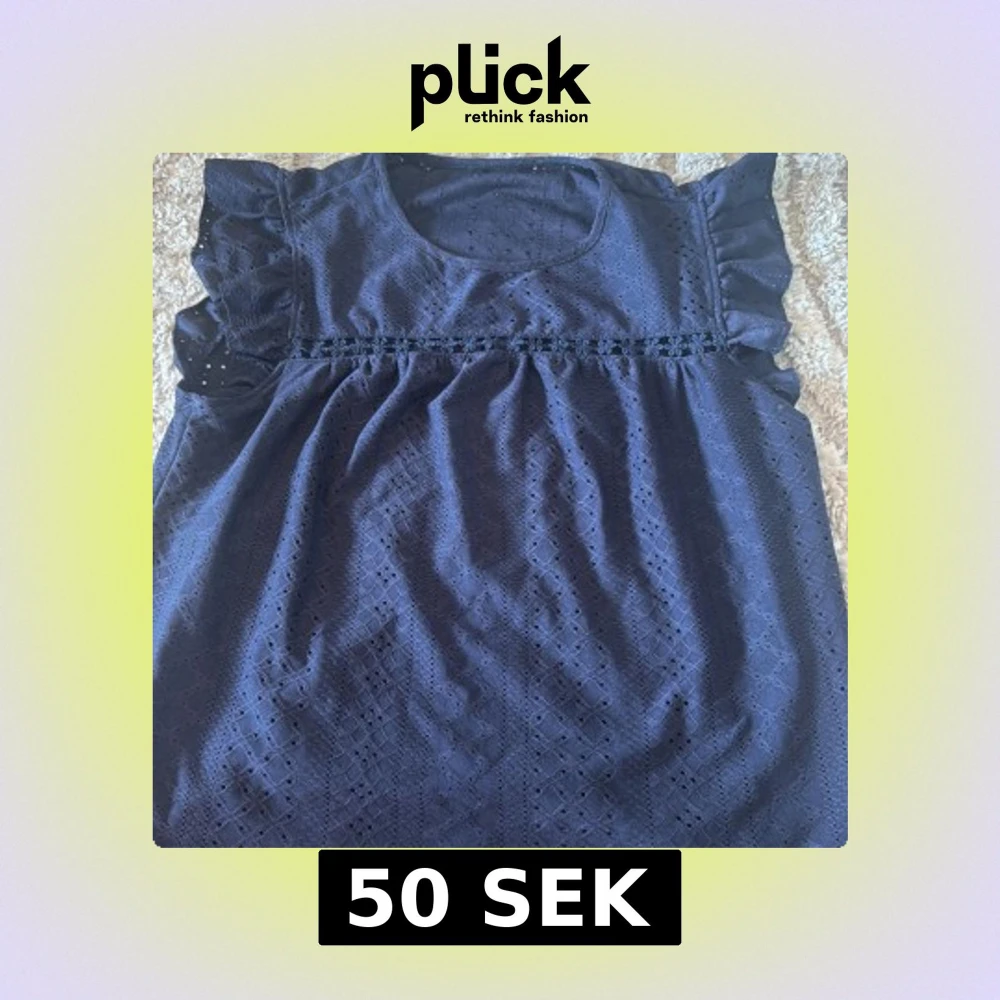 Supersöt mörkblå blus med broderade detaljer och små hålmönster. Blusen har volangärmar och en rund halsringning. Ovanför bröstet finns en dekorativ blomspets som ger extra charm. Perfekt för dig som gillar romantiska och feminina vibes.