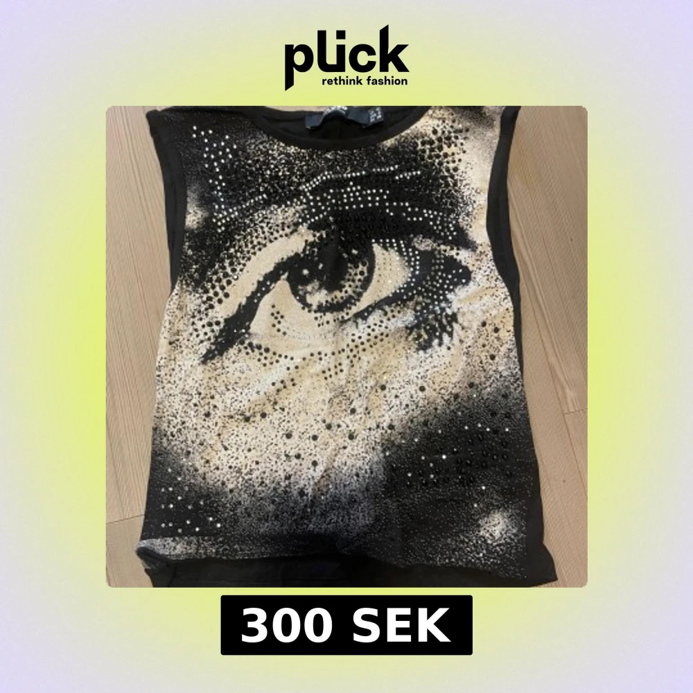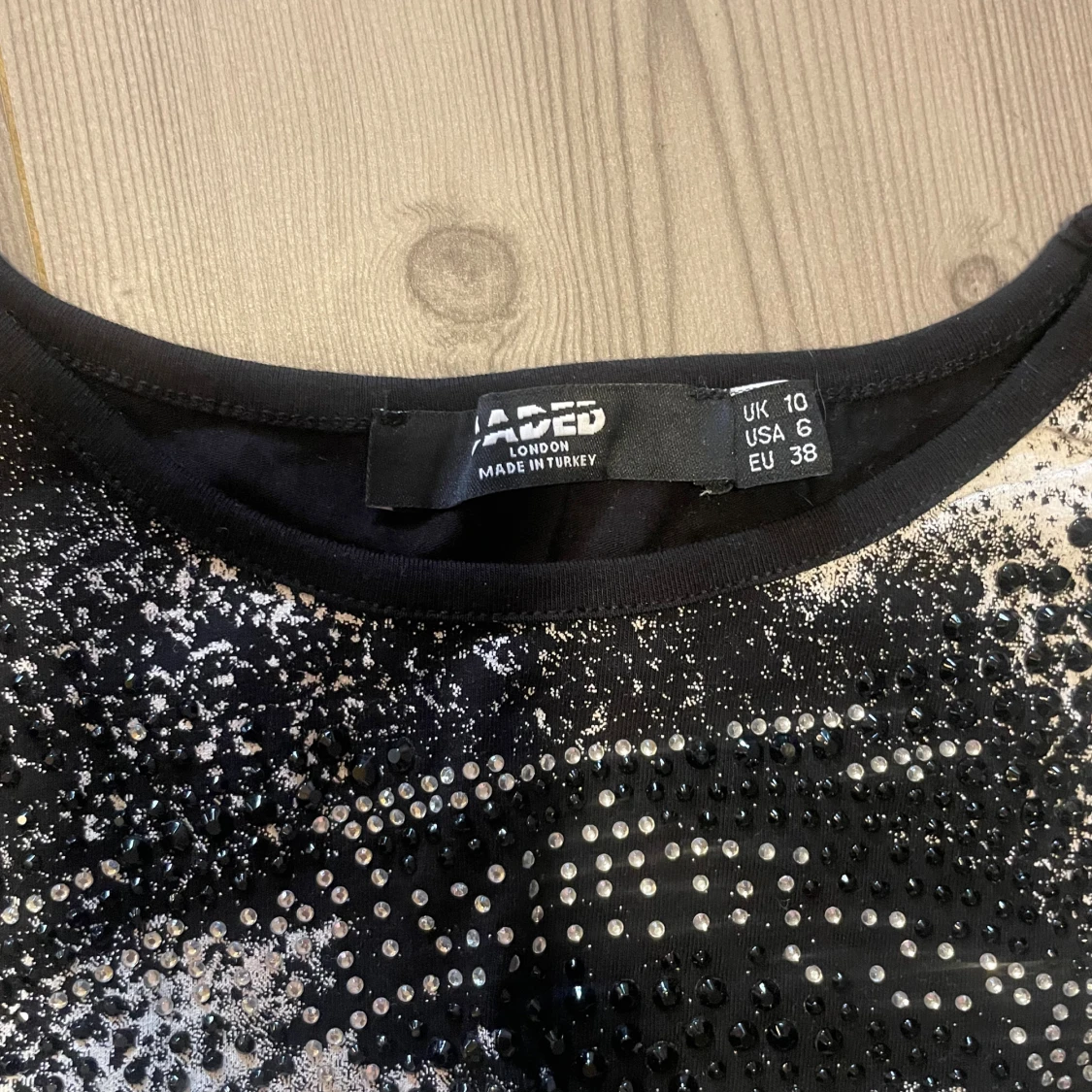 Cool svart topp från Jaded London med ett stort ögonmotiv framtill, dekorerad med glittriga pärlor och prickar i silver och beige.