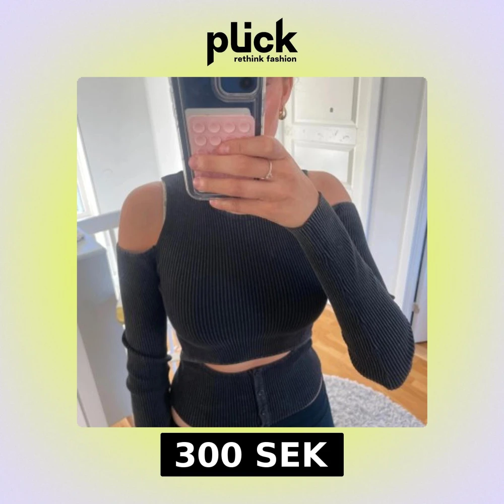 Snygg svart ribbad topp med offshoulder-design och långa ärmar. Toppen är croppad och har knappar framtill för en trendig look. Perfekt för att ge din outfit en edgy touch.