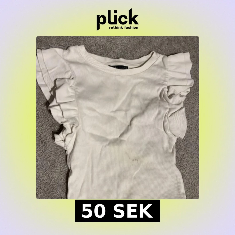 Säljer en söt vit ribbad topp från Zara med volangdetaljer på ärmarna. Storlek S helt okej skick har en fläck(har inte prövat om det går bort i tvätten med fläckborttagning)😊