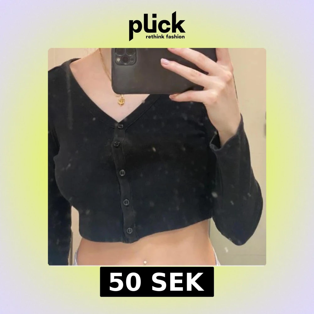 Säljer en svart croppad kofta med knappar framtill. Den har en v-ringad design och långa ärmar, perfekt för en stilren look.