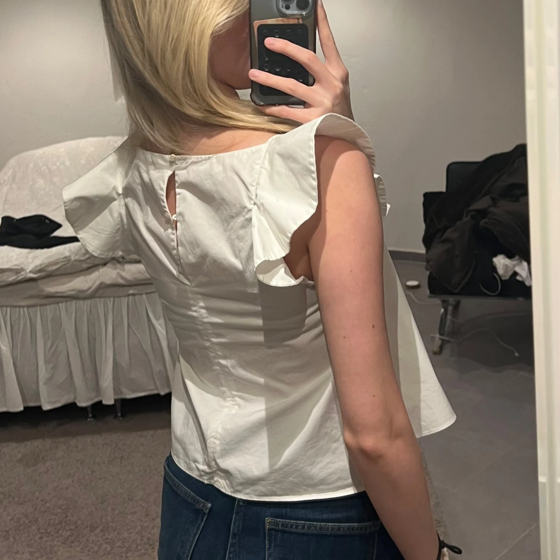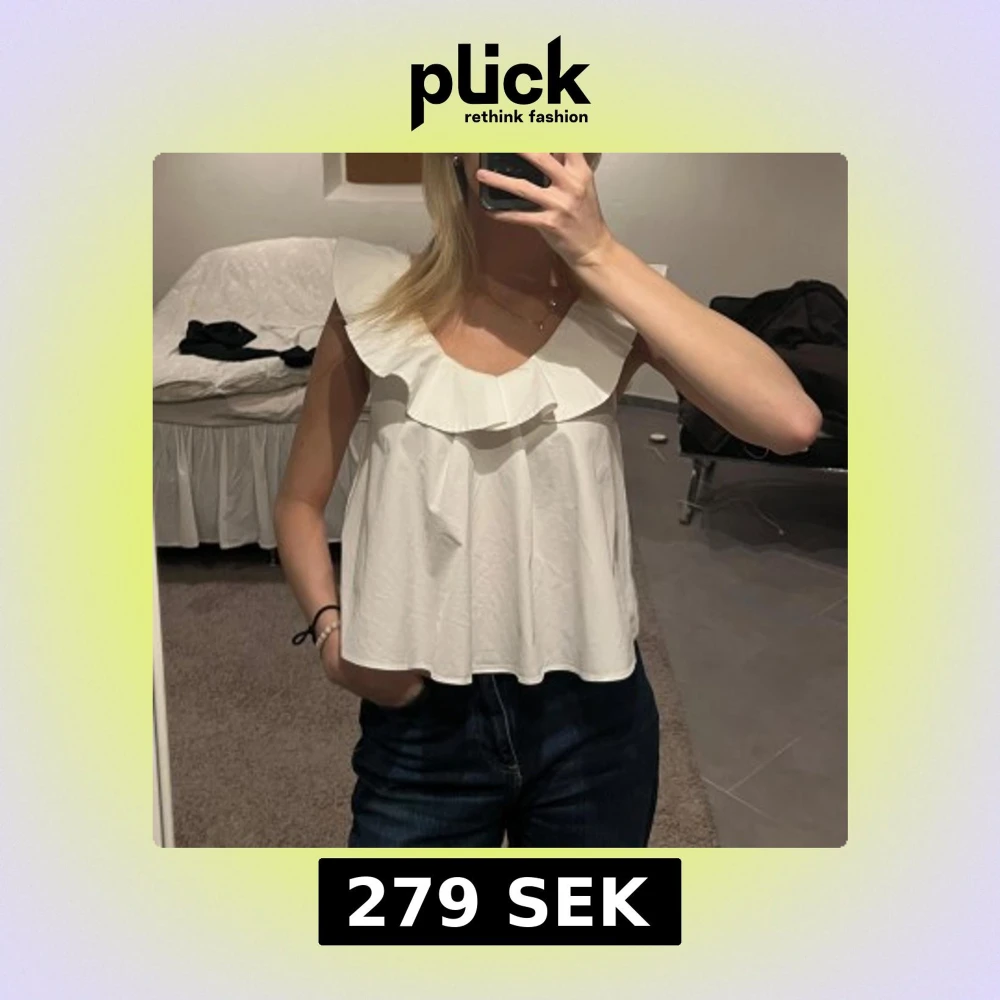 Säljer en söt vit topp med bred volangkrage och ärmlös design. Toppen har en lätt A-linjeform och knäppning bak i nacken. Endast använda fåtal ggr är i nyskick! Från zara storlek xs